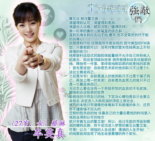者則是姜恩晶。蔡琳在劇中飾演一個新進來的警衛官車英珍,去年剛獲得KBS演技